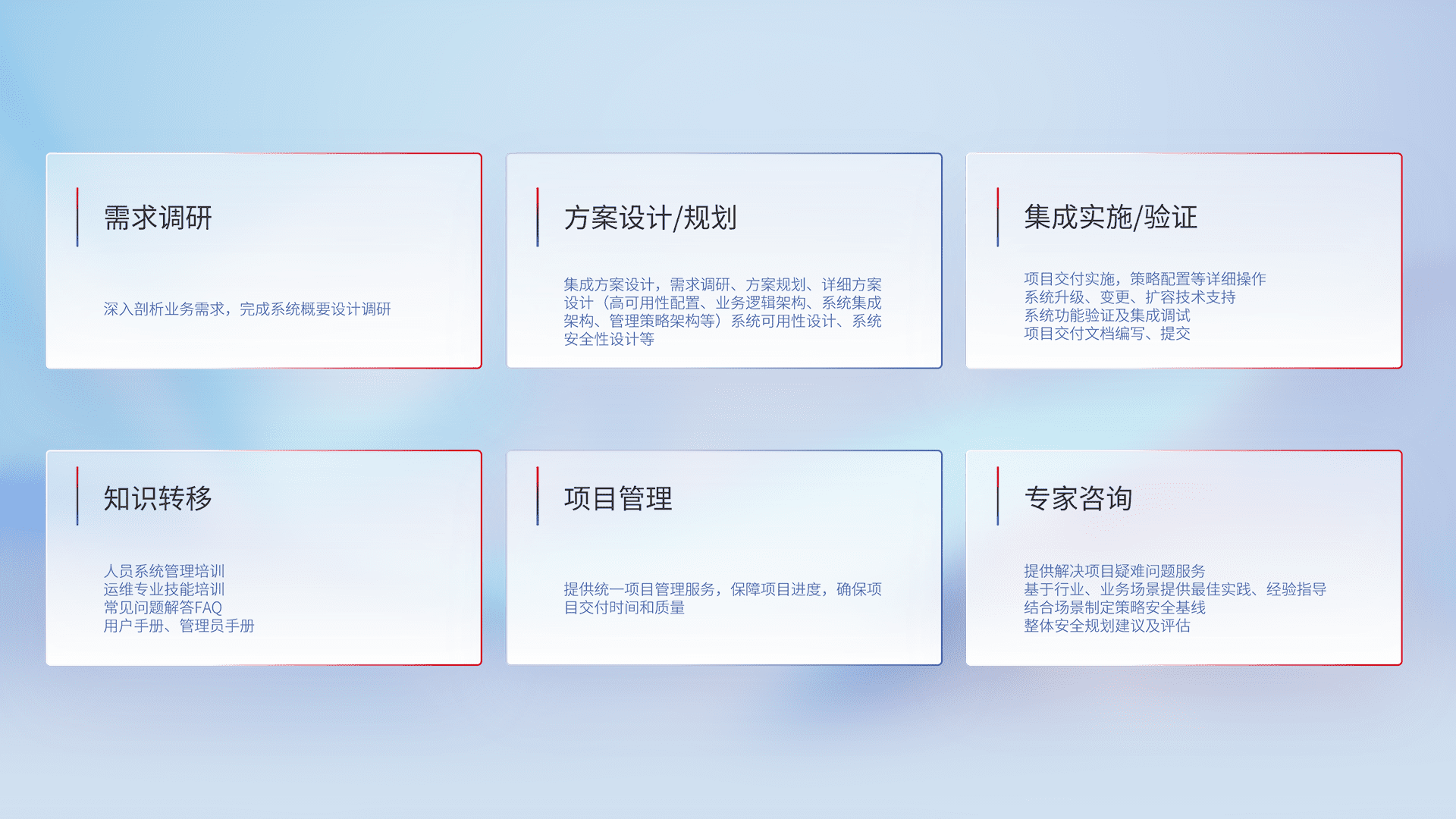 针对客户行业特性,,,,将宏观的安全战略和需求,,,通过专业的交付服务,,实现项目落地,,为客户提供标准规范的集成交付服务。。